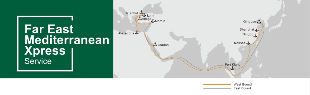 | Port | Qingdao | Shanghai | Ningbo | Nansha | Jeddah | Alexandria | Aliaga | Istanbul | Mersin | Jeddah | Port Klang |